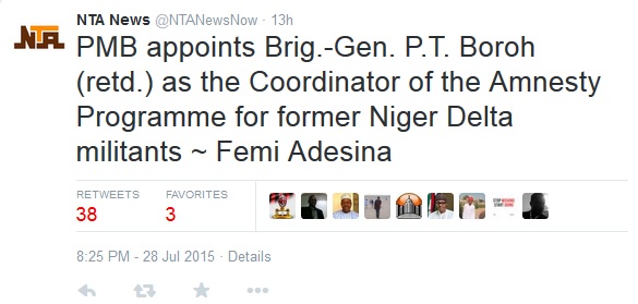 President Buhari has appointed Brigadier-General P.T. Boroh as the Coordinator of the Amnesty Programme for ex Niger Delta militants.
