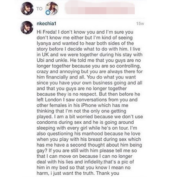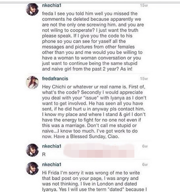 This conversation is between Iyanya's self acclaimed ex girlfriend and his alleged current girlfriend, Freda Francis. Don't know how someone got hold of the Instagram DM between the two ladies, but it has been shared online for all to see. Check out all the convos below;