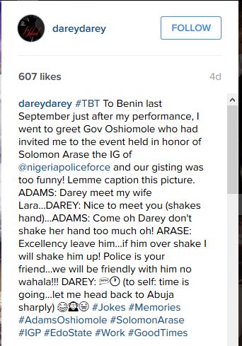 "To Benin last September just after my performance, I went to greet Gov Oshiomole who had invited me to the event held in honor of Solomon Arase the IG of police and our gisting was too funny! Lemme caption this picture.