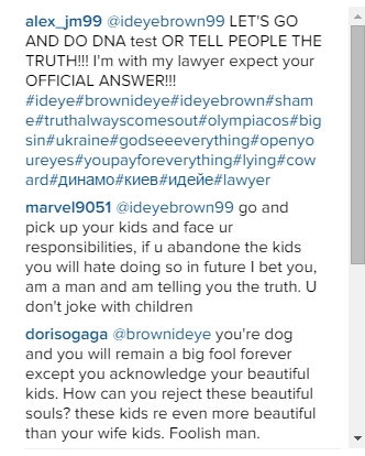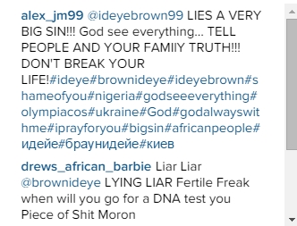 In defense of her husband, Ideye's wife, Damka, got involved in the drama and claimed that Alex was only trying to tarnish her husband's image. The matter has now gained national prominence in Ukraine with many calling on Ideye to submit himself to DNA test and clear his name.