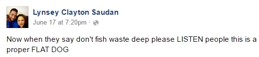 Lynsey Clayton Saudan, who uploaded the photo on Facebook, captioned it: 'Now when they say don't fish waste (sic) deep please LISTEN people this is a proper FLAT DOG.'
