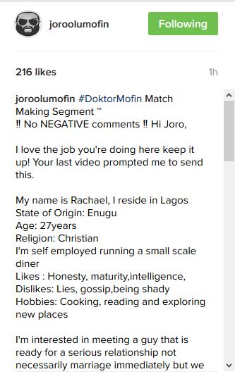 Joro Olumofin's matchmaking session has showcased the hot profile of a young lady based in Lagos named Racheal Nwobodo.