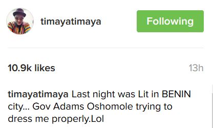 Timaya shared the photo on his Instagram page explaining that the governor was actually trying to dress him up properly right there before everyone.
