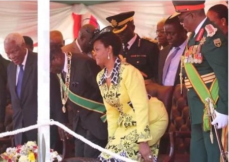 If the tweets by a writer, one Alex Tackie and a few other media reports are anything to go by, President Mugabe has allegedly fired his Chief of Defense Forces, seen seated next to his wife, Grace in the photo below for being too close to his wife and staring down at her butt at an event.