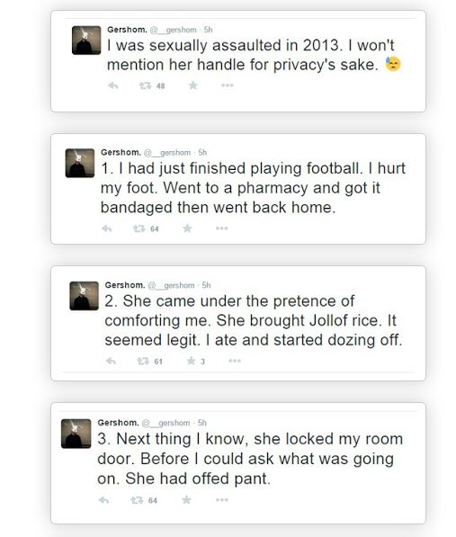 A social media user has recounted his experience in the hands of a young woman who forcefully had a carnal knowledge of him while he was in a weak state.