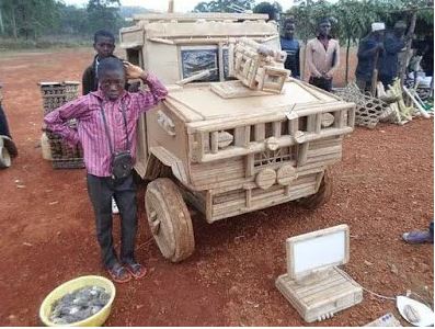 An African boy has showed his expertise in craft-making by creating a Range Rover jeep and a laptop from mere wood.