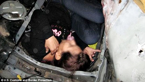 That moment when a U.S Border Patrol agents found illegal and undocumented immigrant woman, 23, stuffed in hidden compartment under child seat in back of a car at Mexico crossing.