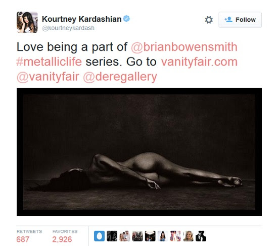 The reality TV star, shared the naked photograph, which is part of photographer, Brian Bowen Smith's Metallic Life series, with fans on social media on Wednesday.