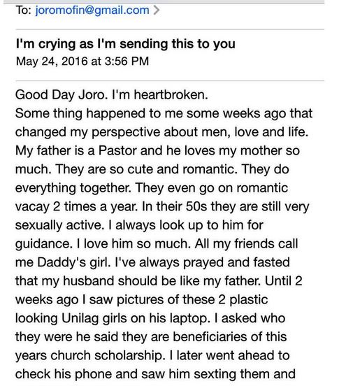 A Nigerian lady whose father is currently having a secret relationship with two female students of the university of Lagos after fronting a holy life of truth and sincerity has cried out.